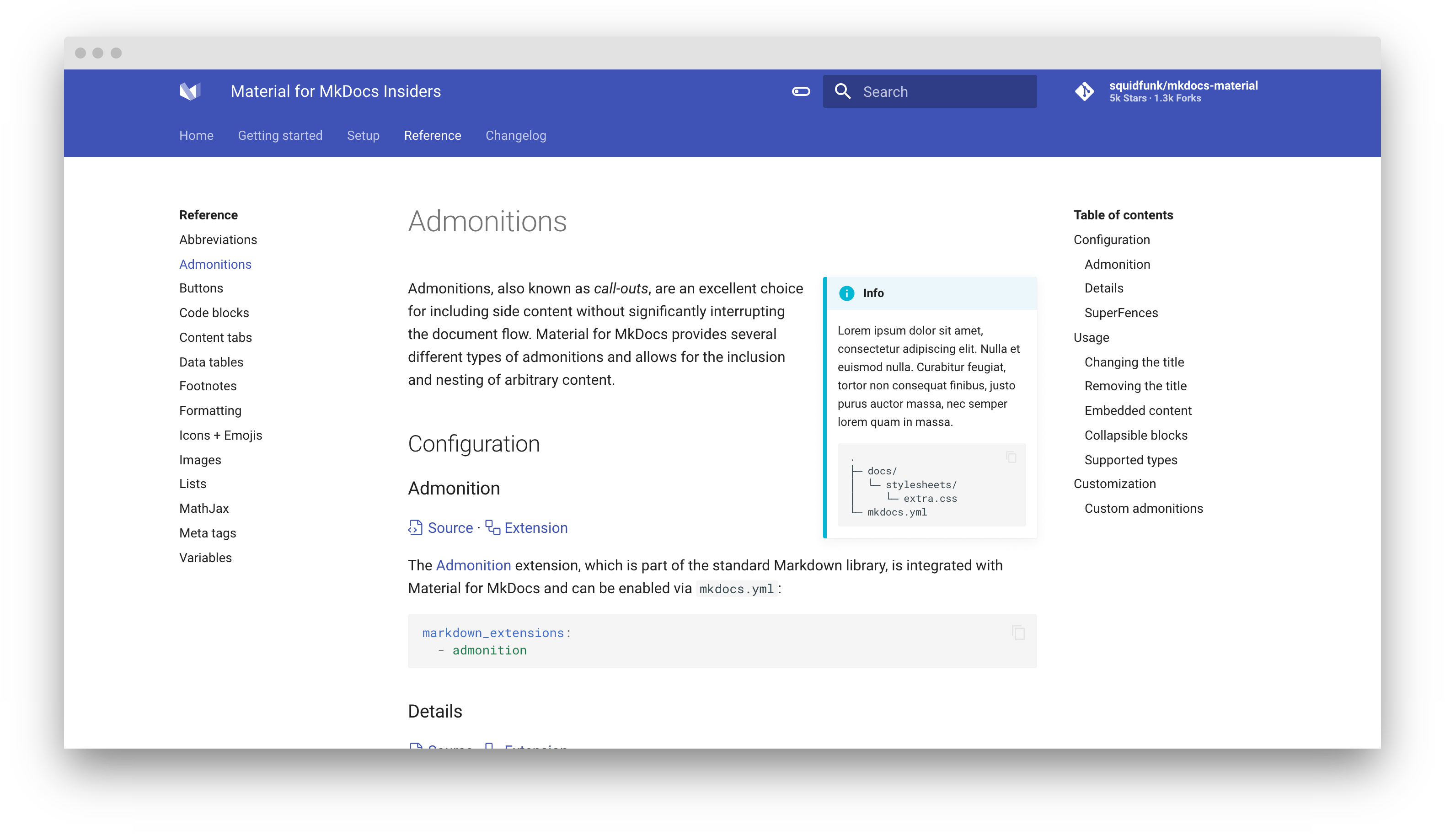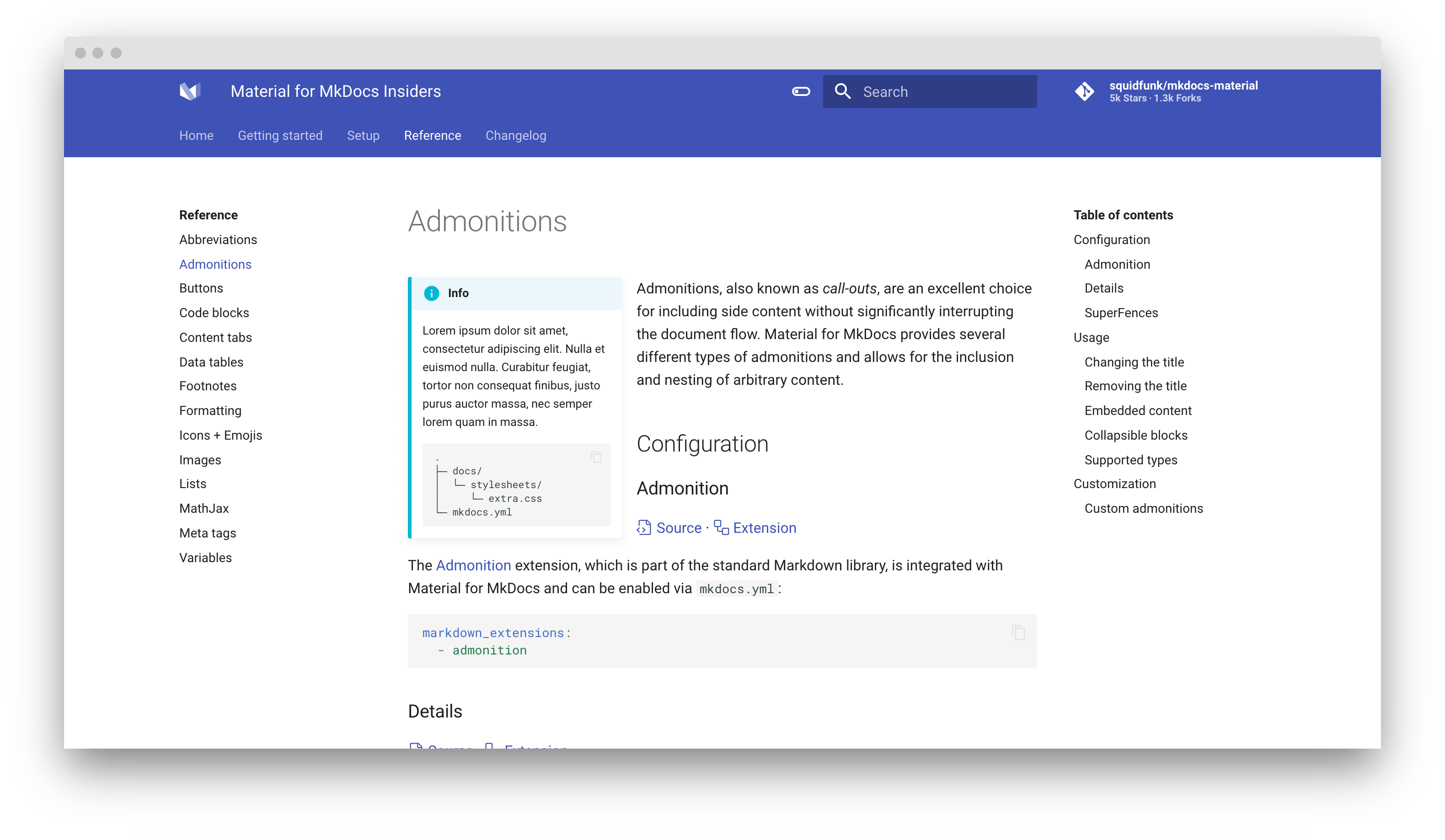 The Admonition extension, which is part of the standard Markdown library, is integrated with Material for MkDocs and can be enabled via mkdocs.yml:
