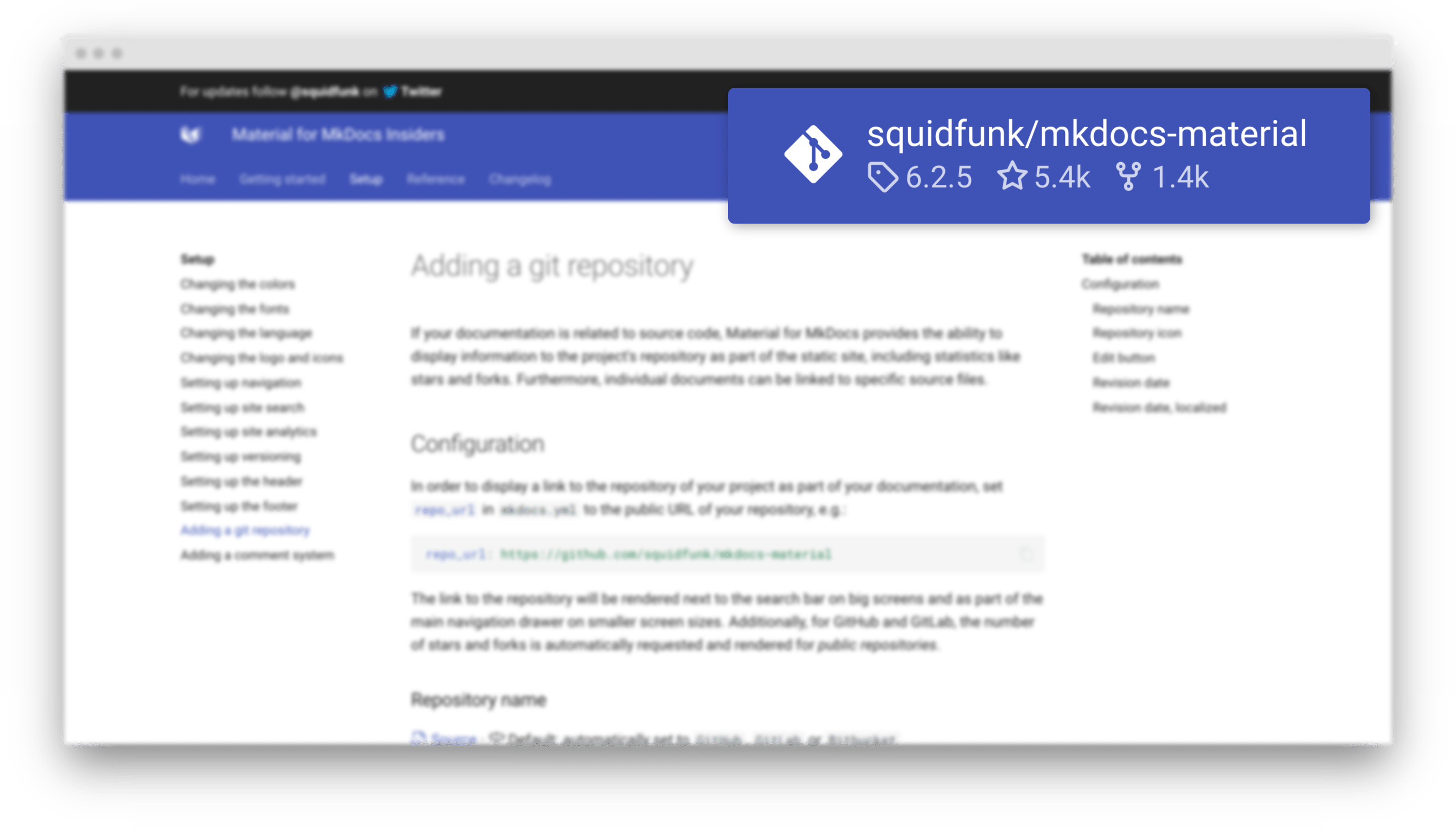 If your documentation is related to source code, Material for MkDocs provides the ability to display information to the project's repository as part of the static site, including statistics like stars and forks. Furthermore, individual documents can be linked to specific source files.